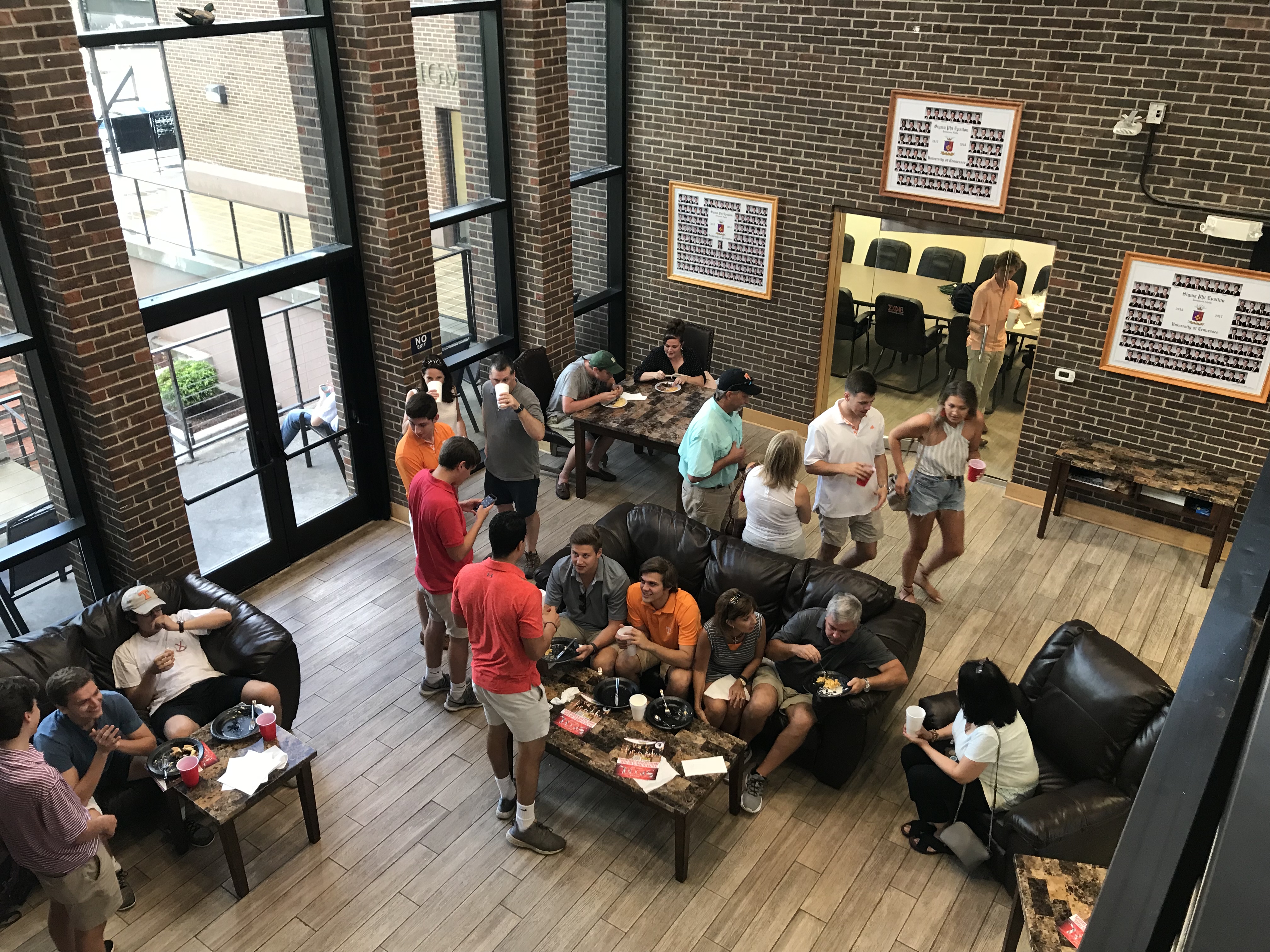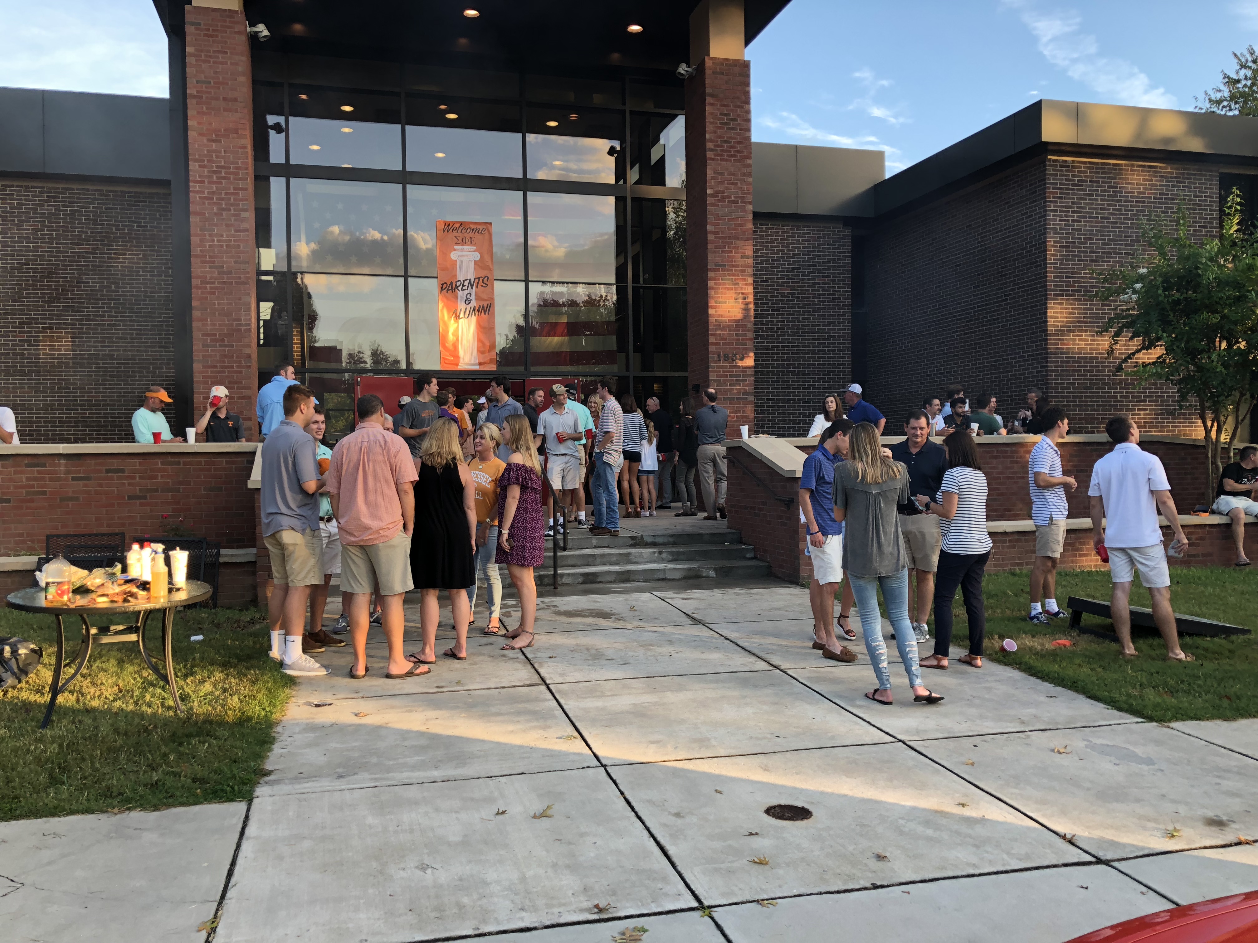 The Friday evening cookout was a big hit. Senior Will Jarvis channeled his inner “Bobby Flay” and smoked up plenty of excellent pulled pork barbecue. Also “Upper Crust” catering, the chapter meal service provider, made the sides. Tables groaned with ribs, corn on the cob, and baked beans, in addition to salad, slaw and other goodies. Saturday morning, and a noon kickoff against University of Texas at El Paso (UTEP) meant a “breakfast tailgate” was in order. Accordingly, the chapter and the AVC provided doughnuts, chicken or sausage and biscuits, and other breakfast essentials.